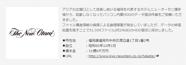 パソコン内蔵HDDのデータ復旧作業をご依頼いただいたホテルニューオータニ博多様によるお客様の声を公開